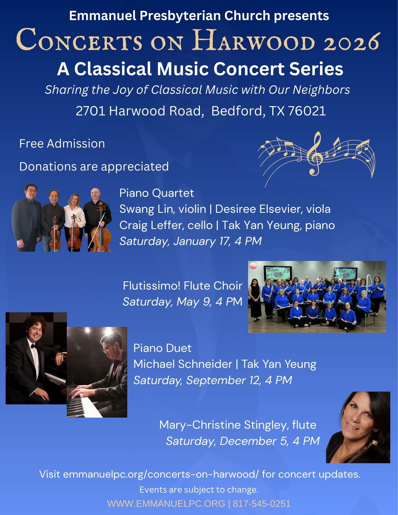 Organized by Dr. Tak Yan Yeung, all our concerts are free to the public and held in the sanctuary at Emmanuel Presbyterian Church, 2701 Harwood Road, Bedford, TX.