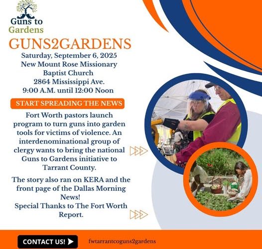 Guns to Gardens Event on Saturday, September 6th, from 9-12 at New Mount Rose Missionary Baptist Church, Fort Worth.